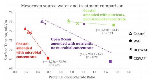 EPS 膠體溶液的 SFT 與 蛋白質(zhì)(更疏水)到多糖(更親水) 集中度,可以作為整體的相對度量 膠體部分的疏水性。 此外,圖1中的數(shù)據(jù) 意味著石油和/或 Corexit 的存在導(dǎo)致增強 EPS 膠體的蛋白質(zhì):多糖比率,但降低了 膠體部分的 SFT。 CEWAF 中蛋白質(zhì)含量較高 處理對應(yīng)的細菌計數(shù)高于其他處理 治療(Kamalanathan 等人,2018 年;Doyle 等人,2018 年)。 DCEWAF 還具有更高的蛋白質(zhì)含量和更高的蛋白質(zhì):多糖 比 WAF 和對照處理。 值得注意的是,當 與不同的中宇宙實驗相比,開闊的海洋中宇宙的油濃度高兩倍,相對 DCEWAF 處理中的 Corexit 含量較高,即它們僅 ~6.3 倍稀釋的 CEWAF,而 DCEWAF 處理來自 用微生物濃縮物修正的沿海水域約 15 倍 稀釋的 CEWAF 和經(jīng)過修正的營養(yǎng)物質(zhì)的沿海水域是 ~ 10 倍稀釋的 DCEWAF(表 1)。 因此,趨勢線的斜率 可能受到 DCEWAF 中 Corexit 數(shù)量的影響,并且 CEWAF 處理 SFT 和蛋白質(zhì):多糖 比率。 由于其表面活性劑特性,Corexit 降低了 SFT,但它 還增強了蛋白質(zhì)的產(chǎn)生,導(dǎo)致比對照和 WAF 處理更高的蛋白質(zhì):多糖比率。 這 相對 SFT 和蛋白質(zhì):對照和 WAF 的多糖位置 可能是由膠體和海水的組成和濃度的微小差異產(chǎn)生的。