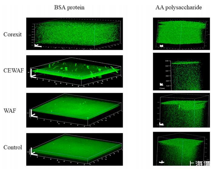 四種治療的共聚焦激光掃描顯微鏡 (CLSM) 帶有模型 EPS 組件的處理如圖 3 所示。 ASW 顯示在左側(cè) BSA 的 0.1% 垂直系列溶液中 右邊是一系列 0.1% 的海藻酸溶液。 橫向, 面板顯示了 Corexit、CEWAF、WAF 的相應(yīng)處理, 和對照,用于 BSA 和海藻酸溶液。 綠色熒光探針 CTC 突出顯示與陰離子結(jié)合的親水性 Ca2+ 多糖和蛋白質(zhì)的區(qū)域。 對于海藻酸和 BSA實驗,單獨使用Corexit就可以分散模型分子 無界面積聚。 圖像也顯示出明亮密集 微聚集體中較高傾向的綠色熒光 Corexit 比在其他治療中看到的要多。 海藻酸面板全部顯示 聚集體的分散,而 BSA 面板顯示主要在界面處的蛋白質(zhì)。 CEWAF 海藻酸和 BSA 可以生成 清晰的界面層。 CEWAF 中的 BSA 顯示聚合 當它們向上擴散時在垂直方向上被夸大 隨著圖像曝光的時間。 此外,BSA CEWAF 顯示聚集體似乎在液體表面上方,因為它們是 在未顯示的泡沫層之內(nèi)和之上。 具有主要親水部分的控制處理表現(xiàn)出較少的分散 和不太明顯的界面層。 雖然垂直尺度較小 對于 BSA 圖像比對于海藻酸圖像,仍然很明顯 海藻酸分散在整個體積中,而 BSA 迅速擴散到界面。 唯一的例外是 Corexit 處理顯示沒有界面積聚和完全分散 海藻酸和BSA。