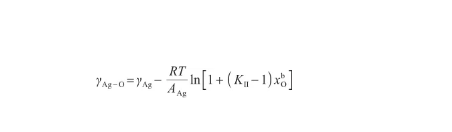 由式(12)和(13)可以看出,Butler方程計(jì)算較為復(fù)雜??紤]液態(tài)氧的表面張力很小[14],可以認(rèn)為γO≈0。另外,由于Ag-O系中O原子數(shù)遠(yuǎn)小于Ag原子數(shù)[29],可以將Ag-O溶體視為理想溶體。此時(shí),GE,b=G=G=0。根據(jù)文獻(xiàn)[18],當(dāng)式(12)所示的Butler方程用于描述理想溶液時(shí),通過(guò)假設(shè)系統(tǒng)內(nèi)兩組分具有相等的摩爾表面積,可以得到改進(jìn)的Butler方程。這個(gè)改進(jìn)的Bulter方程能夠推導(dǎo)出Gibbs吸附方程和Langmuir方程,被認(rèn)為是表面張力和溶液吸附的根本方程。因此,令A(yù)Ag=AO,將式(12)變換為: