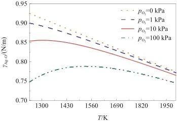 圖6研究了在不同氧氣壓力條件下,γAg-O隨溫度的變化關(guān)系。由圖可知,當(dāng)氧氣壓力低于10 kPa時(shí),γAg-O與溫度呈負(fù)相關(guān)。而當(dāng)氧氣壓力高于10 kPa時(shí),隨著溫度升高,γAg-O呈現(xiàn)先增大后減小的趨勢(shì),并且隨著氧氣壓力增加,這種轉(zhuǎn)變幅度增大。這是因?yàn)棣肁g-O受溫度和氧溶解度的共同影響。一方面,隨著溫度升高,液態(tài)Ag的表面張力(γAg)降低,從而導(dǎo)致γAg-O降低;另一方面,液態(tài)Ag-O系中的氧溶解度與溫度呈負(fù)相關(guān),當(dāng)溫度升高時(shí)氧溶解度下降,導(dǎo)致表面氧吸附量減少,進(jìn)而引起γAg-O增加。因此,當(dāng)溫度較低時(shí),氧溶解度成為影響γAg-O的主要因素;而在較高的溫度條件下,溫度成為主要因素。