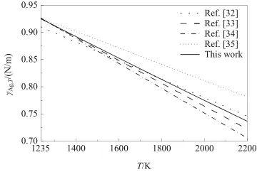 根據(jù)式(7),計(jì)算了液態(tài)Ag的表面張力γAg,T,結(jié)果如圖3所示??傮w上,隨著溫度的升高,γAg,T呈現(xiàn)近似線性下降的趨勢(shì)。從圖中可以看出,γAg,T的預(yù)測(cè)值與文獻(xiàn)[32-34]具有較好的一致性,但略低于文獻(xiàn)[35]。