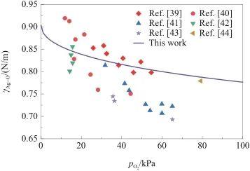 根據(jù)式(33),計(jì)算了1350 K下液態(tài)Ag-O系的表面張力γAg-O,并將計(jì)算結(jié)果與文獻(xiàn)數(shù)據(jù)[39-44]進(jìn)行比較,如圖5所示。觀察圖5可知,γAg-O與氧氣壓力呈負(fù)相關(guān)。在較低的氧氣壓力下,γAg-O的下降幅度比較顯著;而隨著氧氣壓力增加,γAg-O的下降幅度逐漸減小。另外,計(jì)算結(jié)果與文獻(xiàn)[39,40,44]吻合良好,但高于文獻(xiàn)[41-43]。這種差異是可以接受的,因?yàn)樗捎媚P蛢H考慮了溫度和氧氣壓力,而在實(shí)驗(yàn)過(guò)程中,系統(tǒng)的表面張力不可避免地受到雜質(zhì)的影響。