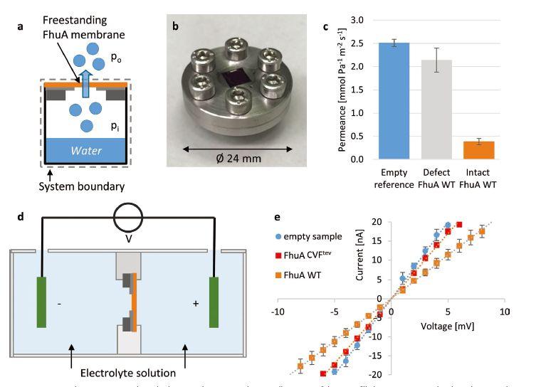 圖5、通過FhuA膜的水和離子滲透。a)覆蓋有氮化硅膜窗口的充水容器的示意圖,其用于測量FhuA WT膜的水滲透。由從杯內(nèi)到杯外的水蒸氣壓差驅(qū)動(dòng)(pi-p0)(a)中所示的杯子的照片。c)FhuA WT膜的水滲透性為3.87×104 mol Pa-1 m?2 s-1(空參考25.13×104 mol Pa-1 m?2 s-1誤差條表示至少三個(gè)樣品的平均值的標(biāo)準(zhǔn)誤差。d)用于測量FhuA膜的離子滲透性的實(shí)驗(yàn)裝置的示意圖。離子在電極之間擴(kuò)散的唯一方式是滲透氮化硅膜窗口中的孔頂部的FhuA膜。e)在磷酸鹽緩沖液(10×10?3 m NaCl,10×10?3 m恒定斜率對應(yīng)于4.0mS(空參比)、3.4mS(FhuA?CVF)、3.4mS(FhuA?CVF)和3.4mS(FhuA?CVF)的電極之間的恒定電導(dǎo).