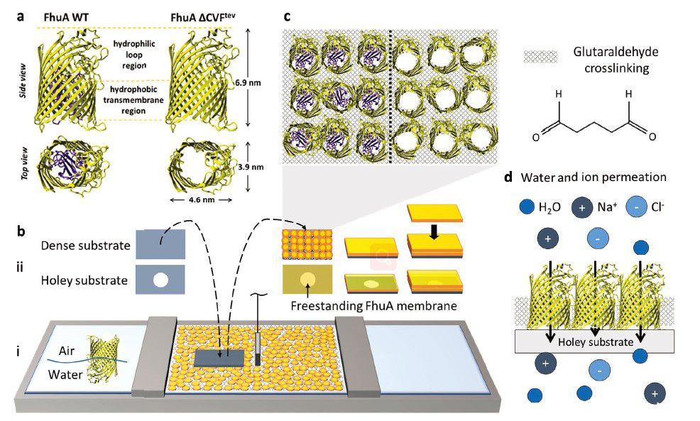 圖1、跨膜蛋白FhuA的交聯(lián)2D膜片。a)使用β-桶蛋白FhuA(跨膜蛋白鐵羥酸鹽攝取蛋白組分A)的兩種變體。在FhuA WT中,軟木結(jié)構(gòu)域阻塞大部分孔內(nèi)部,而該軟木結(jié)構(gòu)域被生物技術(shù)去除以形成開孔變體FhuA?CVF電子伏特兩種FhuA變體具有相同的尺寸,并且其特征在于蛋白質(zhì)上部的親水性環(huán)區(qū)和蛋白質(zhì)下部的疏水性跨膜區(qū)。b)應(yīng)用Langmuir技術(shù)形成超大2D FhuA膜片。(i)由于它們的兩親性,當(dāng)擴(kuò)散到空氣-水界面時(shí),F(xiàn)huA分子占據(jù)很大程度上直立的取向。(ii)當(dāng)在朗繆爾槽的屏障之間緊密壓縮并與戊二醛交聯(lián)時(shí),F(xiàn)huA膜片可以通過重復(fù)的水平浸漬層疊在基底的頂部。c)由FhuA WT(左)或FhuA?CVF制成的膜的示意性俯視圖電子伏特d)FhuA膜在水和離子滲透方面進(jìn)行表征。