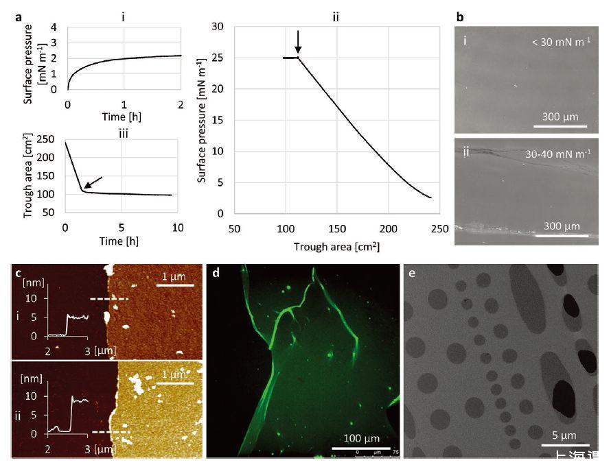 圖2、a)在空氣-水界面處的FhuA膜并轉(zhuǎn)移到基底上。(i)吸附,(ii)壓縮,和(iii)在膜制造期間從0.32nmol FhuA WT涂布在磷酸鹽緩沖液頂部測量的谷面積-時(shí)間曲線在(ii)和(iii)中,戊二醛的注射用箭頭標(biāo)記。B)相應(yīng)的BAM成像顯示(i)在高達(dá)30 mN/m的表面壓力下均質(zhì)的FhuA膜-1.(ii)表面壓力超逾30mN/m)(i)一個(gè)或(ii)兩個(gè)FhuA膜片的AFM圖像,所述膜片層疊在硅基底的頂部上(左半部分用注射器尖端刮去)。高度分布屬于圖像中的虛線,并且指示(i)5和(ii)9 nm的膜厚度。d)單個(gè)FhuAΔCVF的共聚焦熒光顯微鏡圖像,用熒光標(biāo)記物標(biāo)記的硅襯底上的薄膜片e)獨(dú)立地覆蓋TEM網(wǎng)格(淺灰色)的結(jié)構(gòu)化碳膜中的孔(深灰色)的FhuA WT膜的HIM圖像。黑色區(qū)域顯示膜中的缺陷。