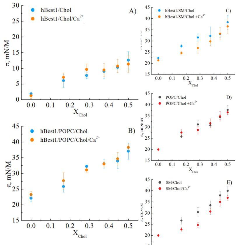 圖1.膽固醇對(A)hBest1、(B)hBest1/POPC、(C)hBest1/SM、(D)POPC和(E)SM單分子層的凝聚效應(yīng)(Chol的摩爾分數(shù)為0.167;0.285;0.375;0.444和0.5)在存在或不存在Ca 2+的情況下,在35±2°C。數(shù)據(jù)表示為平均值±SE,n=7。