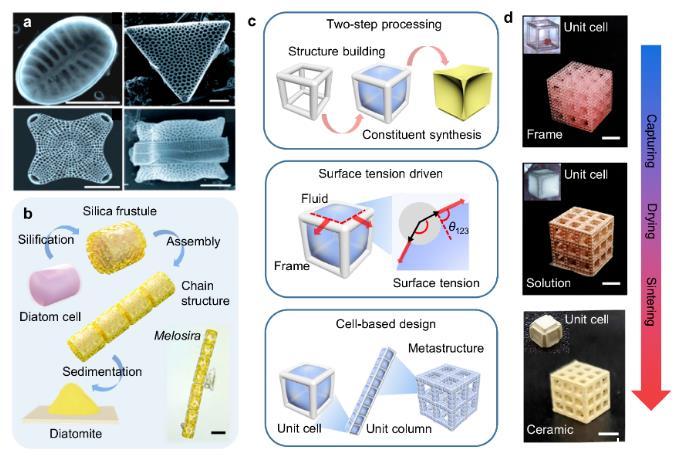 硅藻獨特的生物礦化過程使硅藻擁有多種多樣的硅酸鹽外殼形貌(圖1a)。不同于陶瓷3D打印的逐層增材制造,硅藻殼的生物礦化由結構成型和成分匹配兩部分組成,硅藻細胞構成了最開始的有機骨架,而持續(xù)的硅化過程則進一步合成了硅酸鹽外殼的主要成分。這種將結構成型和成分匹配分開的兩步法策略可以有效提高合成速度。