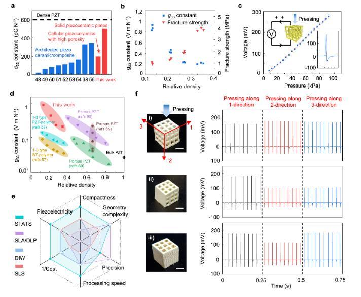 為進一步闡述所開發(fā)的STATS制造工藝的優(yōu)異性,研究團隊制備了一系列經(jīng)過三維結構設計的多孔壓電陶瓷,并對其機械性能和壓電性能進行了表征(圖2)。STATS法加工的多孔壓電陶瓷具有整體多孔但局部致密的特點,即使在相對密度(多孔陶瓷與實心塊體陶瓷的密度比值)較低的情況下(0.13-0.34),也能具有較高的斷裂強度(1.0-3.9 MPa)和壓電常數(shù)d33(200 pC N-1)。為進一步評估壓電陶瓷超材料的壓電響應,研究團隊基于由周期性結構單元組成的有機骨架制備了一系列具有不同三維結構的多孔壓電陶瓷,該方法加工的壓電陶瓷展示出優(yōu)異的壓電響應和各向異性。