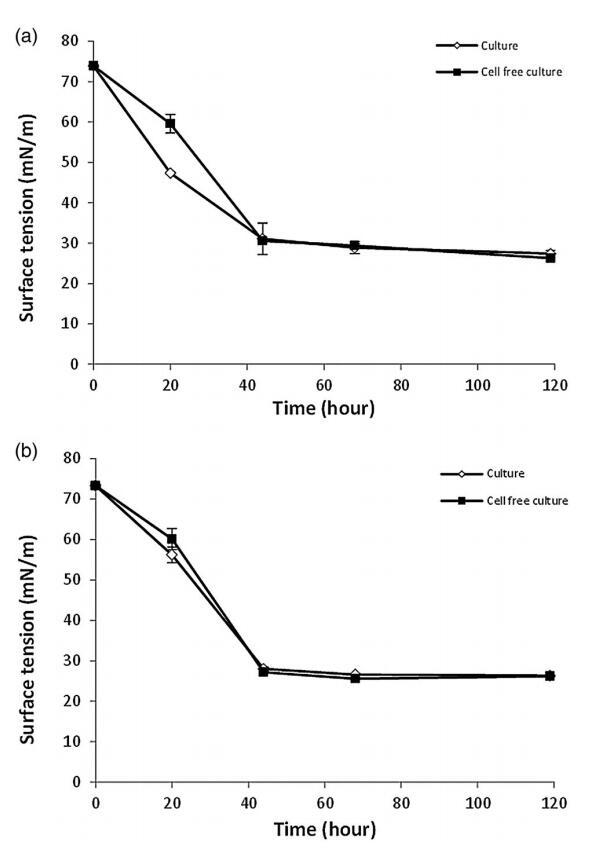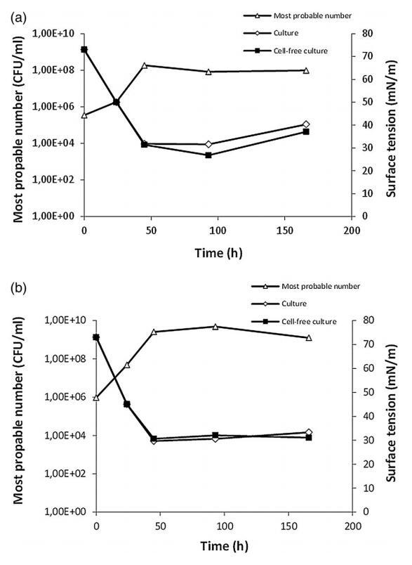 菌株紅球菌屬。 菌株 LF-13 和紅球菌屬。 大約 2 天后,菌株 LF-22 達(dá)到穩(wěn)定期(圖 1)。 LF-13 和 LF-22 的培養(yǎng)物表面張力的最低值分別為 31.8 和 29.3 mN m-1,當(dāng)培養(yǎng)物達(dá)到穩(wěn)定期時(shí)(圖 1)。 無(wú)細(xì)胞制劑的值顯示出與培養(yǎng)物類似的降低,表明生物表面活性劑被釋放到培養(yǎng)基中。 從工業(yè)角度來(lái)看,將生物表面活性劑分泌到培養(yǎng)基中的分離物很有趣,因?yàn)檫@使得生物表面活性劑的純化過(guò)程更簡(jiǎn)單。 [16,44,45]