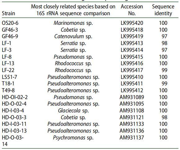 通過(guò) 16S rRNA 基因序列分析對(duì)具有顯著 SAC 活性的 18 個(gè)分離株進(jìn)行分類鑒定(表 2)。 紅球菌除外。 菌株 LF-13 和紅球菌屬。 在菌株 LF-22 中,大多數(shù)鑒定的 SAC 生產(chǎn)者是革蘭氏陰性菌,屬于 γ-變形菌綱。 也有報(bào)道稱 γ-變形菌在寒冷海洋地區(qū)的石油污染地點(diǎn)占優(yōu)勢(shì)。 [21-24] 先前對(duì)石油污染地點(diǎn)的研究表明,假單胞菌、假交替單胞菌、冰川、海藻和紅球菌是極地、海洋區(qū)域。[21,22,25-28]