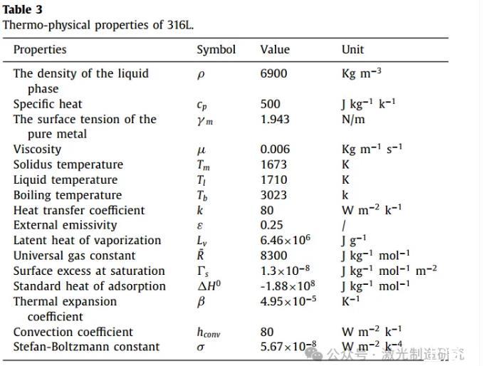 圖1(A)中顯示了計(jì)算領(lǐng)域的圖形說(shuō)明。計(jì)算域的大小設(shè)置為20 mm×2 mm×25 mm。計(jì)算域劃分為1.25億個(gè)邊長(zhǎng)為0.02 mm的六面體網(wǎng)格。在初始狀態(tài)下,將厚度為20 mm的下部設(shè)置為工件層(階段2),將厚度為5 mm的上部設(shè)置為環(huán)境空氣層(階段1)。前壁(Y=0)被設(shè)置為對(duì)稱邊界條件,頂面(Z=25 mm)被設(shè)置為壓力輸出邊界條件,其他表面被定義為壁邊界條件。使用了Ansys-FLUENT®軟件用于模擬。采用C語(yǔ)言編寫的用戶自定義函數(shù)(UDF)實(shí)現(xiàn)光線跟蹤過(guò)程。圖1(B)顯示了光線追蹤過(guò)程的驗(yàn)證案例,在該案例中,一束平行光束被射入具有不同表面粗糙度的方腔。圖1(C)表明,在高Ra條件下,隨著表面粗糙度的變化,能量分布明顯改變,更多的能量集中在第一反射區(qū)。表3列出了模擬中使用的物理特性。