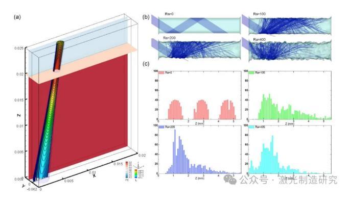 圖1.(A)計(jì)算區(qū)域和高斯熱源分布示意圖;(B)不同表面粗糙度下激光光線追蹤模型的驗(yàn)證;(C)不同表面粗糙度下的反射點(diǎn)分布。