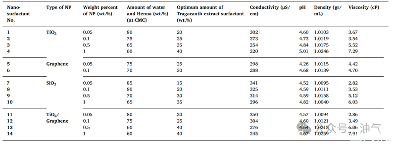 本研究研究了石墨烯、二氧化鈦(TiO2)和二氧化硅(SiO2)納米顆粒、TiO2和石墨烯的復(fù)合納米粒子以及指甲花提取物表面活性劑的納米復(fù)合物對(duì)降低油水界面張力的影響。研究人員使用溶膠-凝膠技術(shù)合成上述納米顆粒,并采用天然水性懸浮表面活性劑(黃芪膠提取物)對(duì)納米表面活性劑的穩(wěn)定性進(jìn)行了研究。通過(guò)電導(dǎo)率、濁度和界面張力實(shí)驗(yàn)測(cè)定了指甲花提取物表面活性劑的CMC值。為了穩(wěn)定重量百分比不同且納米顆粒類(lèi)型也不同的納米表面活性劑,使用粒徑和zeta電位測(cè)量來(lái)確定黃芪膠表面活性劑各自的最佳濃度。最后,通過(guò)界面張力測(cè)量,使用穩(wěn)定的納米表面活性劑來(lái)研究其對(duì)IFT的影響。