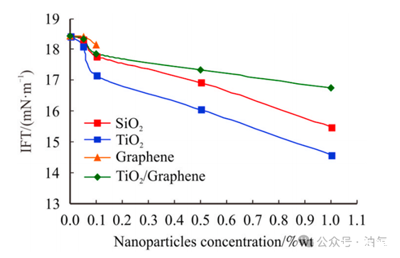 5.單獨(dú)的石墨烯納米顆粒對(duì)降低油水界面張力的影響可以忽略不計(jì)。加之其與TiO2納米顆粒(純TiO2納米顆粒)合成TiO2/石墨烯納米復(fù)合材料時(shí),不利于發(fā)揮作用。因此,石墨烯納米顆粒對(duì)EOR來(lái)說(shuō)在操作上和經(jīng)濟(jì)上都不可行。