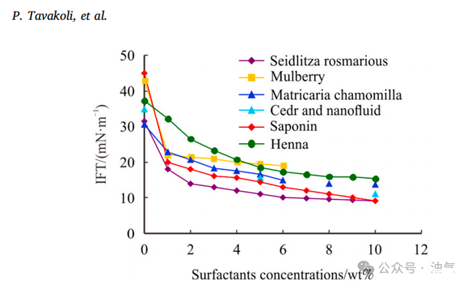 圖3.不同表面活性劑在煤油中作為油相的界面張力:Seidlitzia Rosmarinus、桑葉、洋甘菊、雪松和納米流體、皂角苷(敘利亞棗樹(shù))和指甲花。誤差線(xiàn)表示±5%的標(biāo)準(zhǔn)偏差