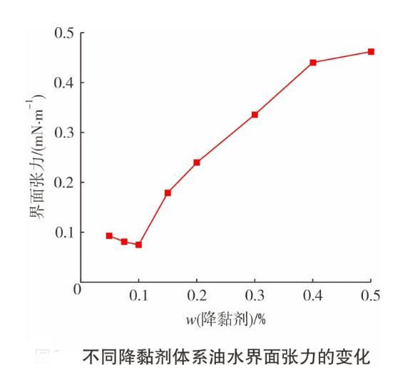 圖1為在不同降黏劑質(zhì)量分?jǐn)?shù)下,體系油水界面張力的變化情況。從圖1可知,在降黏劑質(zhì)量分?jǐn)?shù)為0.05%~0.10%時,界面張力隨質(zhì)量分?jǐn)?shù)增加而降低。當(dāng)降黏劑質(zhì)量分?jǐn)?shù)超過0.10%時,界面張力開始上升。在低質(zhì)量分?jǐn)?shù)下,降黏劑在油水界面上形成吸附膜,降低界面張力。當(dāng)降黏劑質(zhì)量分?jǐn)?shù)超過臨界膠束含量后,降黏劑在界面聚集數(shù)量增加,吸附層排布更不規(guī)則,導(dǎo)致界面張力升高。