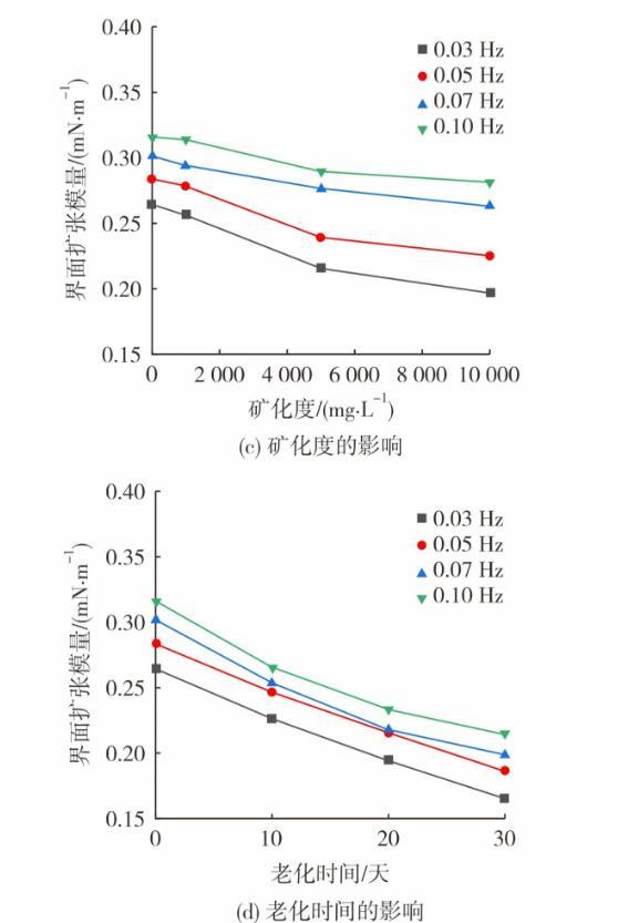 圖3為油藏條件對動態(tài)界面張力及界面擴張模量的影響。采用不同礦化度模擬水配制體系(0.06%(w)凍膠分散體+0.10%(w)降黏劑),在50℃老化10天。圖3(a)和圖3(c)呈現(xiàn)了礦化度對體系界面流變性質(zhì)的影響。從圖3可知,隨著礦化度的提高,老化后體系的動態(tài)界面張力穩(wěn)定值從0.127 mN/m增至0.356 mN/m。降黏劑帶有磺酸鹽基團,有較強的耐溫耐鹽能力,因此界面張力的提升幅度有限。此外,體系的界面擴張模量隨礦化度的增大而減低,這是由于地層水陽離子會對凍膠分散體之間的擴散雙電層產(chǎn)生壓縮作用,減小凍膠分散體表面負(fù)電量,降低其分散穩(wěn)定性,體系黏度隨之下降。