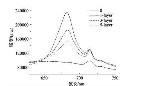 圖4是石莼類囊體膜LB膜在納米ZnO上的室溫?zé)晒獍l(fā)射光譜,類囊體膜的最大熒光發(fā)射峰在683 nm,隨著類囊體膜在ZnO上吸附層數(shù)的增加熒光發(fā)射強(qiáng)度增大。菠菜類囊體膜的熒光發(fā)射光譜表現(xiàn)出相同的趨勢(shì)(結(jié)果未顯示)。