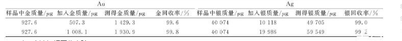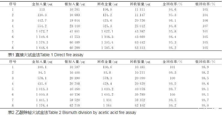 表2結(jié)果為用乙酸除鉍火試金法,再進(jìn)行如表1的實驗,從表2可以看出金加標(biāo)回收率99.2%~101%,銀加標(biāo)回收率98.2%~99.7%,說明已消除鉍的干擾,結(jié)果準(zhǔn)確可靠。