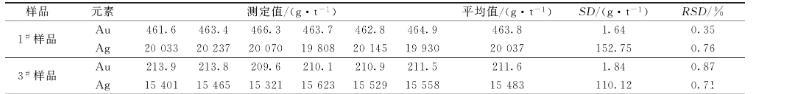 選取兩個粗鉍樣品,1#和3#樣品進(jìn)行實驗,稱取2.000 g粗鉍樣品,按照以上實驗方法進(jìn)行實驗,每個樣品做了6次平行實驗,結(jié)果如表7所示,金相對標(biāo)準(zhǔn)偏差(RSD)為0.35%~0.87%,銀相對標(biāo)準(zhǔn)偏差(RSD)為0.76%~0.71%。