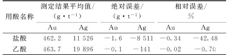 鉍氧化過程中,氧化鉍進(jìn)入灰皿粉末吸收,粗鉍里面大部分金銀留在粉末上方,類似用灰皿灰吹。用硝酸溶解,固體物質(zhì)很快就溶解了,但金銀合粒也被溶解了,所以不能用硝酸溶解。用硫酸溶解,固體物質(zhì)和硫酸幾乎不反應(yīng),所以不能使用硫酸。用鹽酸和乙酸可以順利溶解固體物質(zhì),但鹽酸也溶解金、銀。實驗樣品金含量463.8 g/t,銀含量20 037 g/t,得到結(jié)果如表4所示,從表4可知使用乙酸溶解除鉍結(jié)果準(zhǔn)確,所以選用乙酸作為溶解除鉍用酸。