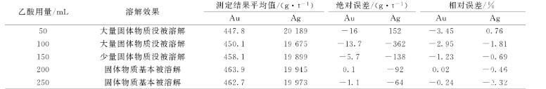 實驗樣品金含量463.8 g/t,銀含量20 037 g/t,進(jìn)行除鉍用酸量的實驗,試驗用酸為乙酸(1+1),結(jié)果見表5,從結(jié)果可以看出50、100 mL乙酸用量,大部分固體物質(zhì)沒被溶解,大部分鉍沒被除去,乙酸用量200 mL時,固體物質(zhì)基本被溶解,結(jié)果較準(zhǔn)確,可以滿足測定要求。在結(jié)果準(zhǔn)確的情況下選擇用量少的,所以實驗選擇乙酸用量為200 mL。
