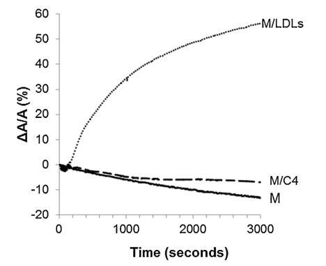 當(dāng)?shù)兔芏戎鞍着c牛精漿混合時 蛋白質(zhì)重量比為 10:1 (BSP:LDLs) 并注射到單層下方,單層的分子面積隨時間記錄 幾乎沒有變化(曲線 M/SP + LDL,圖 5)。 肩膀出現(xiàn)在 大約 400 s 揭示了 BSP 蛋白的弱吸附(這 肩部代表 M/SP 的 5%,上圖曲線)。 然后,該 1000s后分子面積的變化減少并穩(wěn)定。 不會像 M 和 M/SP 曲線的變化那樣減少, 表明 LDLs 成分的吸附,與 它們在界面處的高擴(kuò)散能力(曲線 M/LDL,圖 4)。 因此,SP 中所含 BSP 蛋白在界面處的吸附 由于低密度脂蛋白而大大降低,并且 BSP/低密度脂蛋白的比率非常高 接近最佳值以完全防止 BSP 蛋白質(zhì)影響單層。 磷脂酰膽堿注射量 根據(jù)低密度脂蛋白的組成估計為 4.61 毫克 [33]。 因此,注射了 4.61 mg LDLs 的磷脂酰膽堿 26.6mg精漿蛋白質(zhì),即1mg精漿蛋白質(zhì)需要0.17mg磷脂酰膽堿。