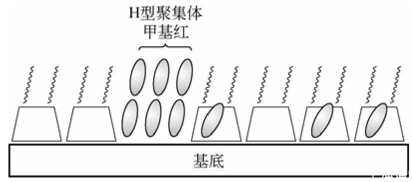 兩親性環(huán)糊精不僅能夠單獨組裝成LB膜,也能夠和其他有機分子共同組裝成雜化LB膜。Matsumoto課題組在兩親性環(huán)糊精和偶氮苯LB雜化膜方面做了大量的工作。因為偶氮苯化合物能夠在光照條件下發(fā)生可逆的順反光異構(gòu)反應(yīng),若將偶氮苯在固體基底上進行組裝將對光儲存、光轉(zhuǎn)換器件的發(fā)展具有十分重要的意義。但是由于在單純LB膜中,偶氮苯分子周圍自由體積很小,限制了順反光異構(gòu)反應(yīng)的發(fā)生,而利用兩親性環(huán)糊精和偶氮苯雜化組裝成LB膜以解決這個問題。研究表明部分偶氮苯被包結(jié)在環(huán)糊精的空腔中,空腔為水溶性偶氮苯發(fā)生可逆的光異構(gòu)化反應(yīng)提供了良好的場所。此外,環(huán)糊精疏水鏈段也能夠成為容納客體分子的場所,而且在膜中并非所有的環(huán)糊精分子都會包結(jié)偶氮苯分子,剩余的未包結(jié)環(huán)糊精為進一步功能化提供了基礎(chǔ)。但是在該雜化膜中會有部分偶氮苯分子形成的聚集體(圖2),所以進一步增加雜化分子的包結(jié)率和分散性是這一類雜化膜的研究方向。