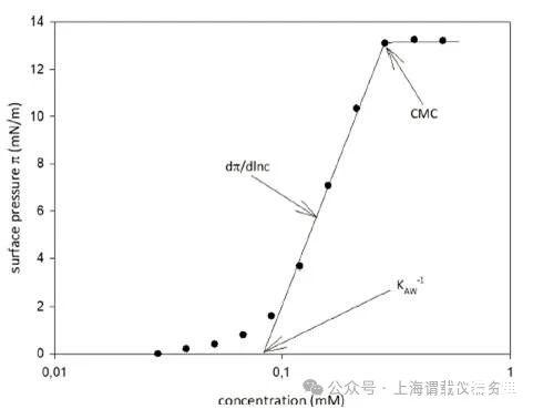 圖1、表面活性分析(SAP):增加一種兩親性物質(zhì)的濃度會導(dǎo)致更高的表面壓力(π)。Kaw?1是空氣-水分配系數(shù),CMC是臨界膠束濃度,dπ/dlnc斜率和描述物質(zhì)在接口的橫截面積。