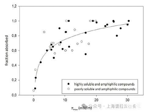 本論文研究人員提出了一種藥物活性分子生物利用度(fa)快速篩選方法-表面活性譜(SAP),作為替代傳統(tǒng)的動物研究和細(xì)胞培養(yǎng)篩選。研究人員使用SAP技術(shù),主要是基于Kibron公司的高通量表面張力分析儀----(Delta-8),該儀器只需要50ul原液就能進(jìn)行完整的滲透率分析。并將溶液中化合物的表面活性譜化合物與生物膜相互作用或穿透生物膜的潛力聯(lián)系起來。用于這種關(guān)聯(lián)的進(jìn)一步參數(shù)包括臨界膠束濃度(CMC)、界面空氣/水分配系數(shù)(KAW?1)和分子在界面的面積要求,即截面面積(AS)等這些表面活性參數(shù)來獲取藥物的生物利用度(fa值)。此方法的提出對于先導(dǎo)化合物的早期篩選研究,因為先導(dǎo)化合物只有少量的化合物可用,SAP方法似乎是一個很有效和快速的工具,可以準(zhǔn)確預(yù)測兩親性化合物的fa值,為新藥研發(fā)提供了重要的技術(shù)支持,這也說明高通量的表面張力分析儀(delta-8)在藥物研發(fā)方面發(fā)揮了重要的作用,尤其是預(yù)測活性藥物分子的生物利用度(fa)提供了一種新的技術(shù)手段。