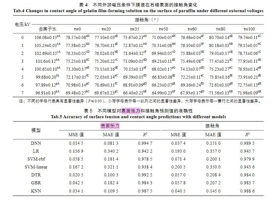 本文探究了在不同電源電壓下通過(guò)感應(yīng)荷電的方式對(duì)明膠液滴荷質(zhì)比、表面張力及接觸角的影響,并通過(guò)深度神經(jīng)網(wǎng)絡(luò)建立模型預(yù)測(cè)。結(jié)果發(fā)現(xiàn),靜電荷電能有效提高明膠液滴的潤(rùn)濕性能,當(dāng)外加電壓為7 kV時(shí),明膠成膜液滴的表面張力可以下降9%~14%,接觸角能夠下降8%~12%。從而為形成更均勻、更完整的可食性涂膜提供新的手段。在明膠的質(zhì)量分?jǐn)?shù)為3%、表面活性劑的質(zhì)量分?jǐn)?shù)為0.05%、吐溫20與司盤(pán)20濃度比為1∶1、電壓為0~7 kV時(shí),深度神經(jīng)網(wǎng)絡(luò)模型對(duì)膜液荷質(zhì)比與表面張力或接觸角的關(guān)系具有良好的預(yù)測(cè)作用,可用于指導(dǎo)實(shí)踐操作。