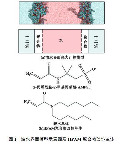 早期的聚合物驅(qū)主要采用部分水解聚丙烯酰胺(HPAM),具有界面活性低、耐溫/耐鹽性差等缺點(diǎn)。通過(guò)對(duì)HPAM進(jìn)行改性,不僅能改善驅(qū)替液的流變性能,還能提高HPAM的界面活性,促進(jìn)HPAM在油水界面的吸附,以降低油水界面張力,起到乳化原油的作用。目前主要通過(guò)試驗(yàn)手段考察原油乳化行為,使用傅里葉紅外光譜、核磁共振等儀器可表征聚合物或表面活性劑的構(gòu)象;利用電鏡可觀(guān)察乳狀液的形貌和尺寸;通過(guò)界面張力測(cè)量可評(píng)價(jià)聚合物、表面活性劑等的界面活性。分子動(dòng)力學(xué)(MD)模擬是基于統(tǒng)計(jì)物理原理,將原子、分子的運(yùn)動(dòng)與體系宏觀(guān)性質(zhì)建立關(guān)系的一種計(jì)算模擬方法。Du等對(duì)3種聚合物驅(qū)油劑進(jìn)行MD模擬,比較不同溶液的黏度,揭示鹽離子誘導(dǎo)聚合物聚集的機(jī)制。Abdel-Azeim等利用MD模擬研究HPAM聚合物和磺化HPAM的締合行為,發(fā)現(xiàn)磺化基團(tuán)與陽(yáng)離子的相互作用較弱,鹽離子的存在會(huì)促進(jìn)聚合物的締合。Kshitij等使用MD模擬計(jì)算熔融聚甲基丙烯酸甲酯的表面張力,其隨溫度變化的結(jié)果與試驗(yàn)測(cè)試結(jié)果相符。界面處的張力主要來(lái)源于界面處原子受到垂直于界面的應(yīng)力不均衡,從而引起界面處產(chǎn)生平行于界面的張力。筆者對(duì)親水性的HPAM進(jìn)行改性,通過(guò)接枝疏水基團(tuán)增強(qiáng)聚合物與油相的相互作用,減弱油水界面處分子受力的不均衡,通過(guò)降低油水界面張力從而獲得高的界面活性。進(jìn)一步通過(guò)接枝具有耐鹽性的磺酸基團(tuán),以提升聚合物在高礦化度儲(chǔ)層中的性能。