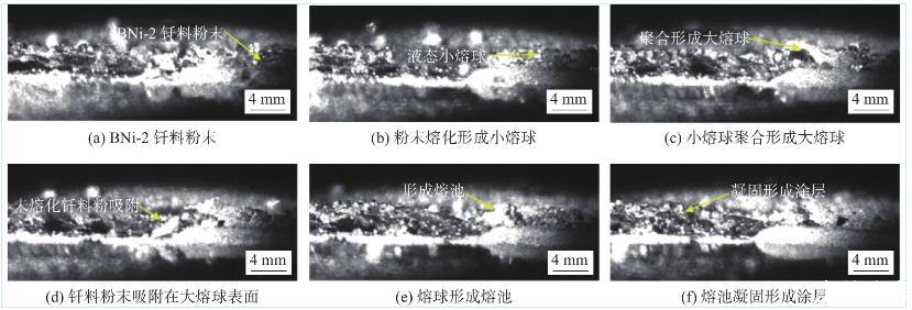 圖3是激光釬涂過程中的超高速攝影照片(4000幅/s),直觀地表征了激光釬涂過程中釬料粉末在激光作用下熔化、鋪展、凝固的過程。從圖3中可看出,在激光釬涂過程中,釬料呈現(xiàn)4種狀態(tài),分別為粉末態(tài)、熔球態(tài)、熔池態(tài)、凝固態(tài)。在激光未掃描的位置,釬料保持原始的粉末狀態(tài),如圖3a所示。被激光束掃到的位置,粉末態(tài)的釬料吸收能量,升溫熔化,形成尺寸較小的液態(tài)熔球,如圖3b所示。隨后,粉末釬料的不斷熔化形成更多液態(tài)小熔球,尺寸較小的熔球互相結合匯聚成尺寸較大的液態(tài)熔球,如圖3c所示。同時可觀察到未熔化的釬料粉末在液/固界面張力作用下,逐漸被吸附到尺寸較大的熔球表面,如圖3d所示。隨著激光逐漸向前掃描,熔球不斷長大,當熔球固相表面張力與重力的合力作用大于液/固界面張力后,大尺寸熔球在基體鋪展?jié)櫇?,形成熔池,如圖3e所示。最后,隨著激光熱源的移動,激光后端的熔池溫度逐漸降低,液態(tài)釬料逐漸凝固,在基體表面形成涂層,如圖3f所示。