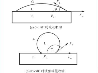 潤濕角θ的大小直接反映了液相對固體表面的潤濕程度,θ越小,潤濕性就越好。當θ為0°時,表示完全潤濕,小于時為潤濕狀態(tài),而大于時為不潤濕狀態(tài)。由于相同體積下,球形的表面積最小,表面張力驅使液體聚集到最小表面積狀態(tài),在釬料熔化后便聚合在一起收縮成球狀,從而發(fā)生液態(tài)釬料聚合現(xiàn)象。