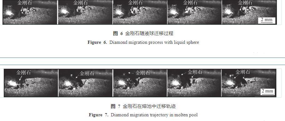 圖6所示為金剛石在液態(tài)球上的運動軌跡。隨著激光熱作用,釬料首先熔化成小液滴,然后匯聚成小球,由圖6可以看出,金剛石在液態(tài)小球上不穩(wěn)定的運動,以致可以見到金剛石表面亮度很高的閃光,這是金剛石反射的激光。圖7是激光釬涂過程中,金剛石在釬涂熔池中的運動路徑。金剛石顆粒首先存在于熔池邊緣底部,隨著釬涂過程的進行,金剛石顆粒沿熔體球面逐漸向上部運動,然后在熔池表面向后方移動,當激光熱源遠離,熔池開始凝固,金剛石顆粒被固結于涂層近表面位置,保持一定的出刃高度,有利于發(fā)揮耐磨作用。金剛石運動總趨勢是沿液態(tài)球表面或熔池邊緣向液/氣界面遷移。
