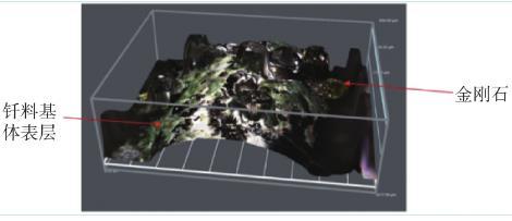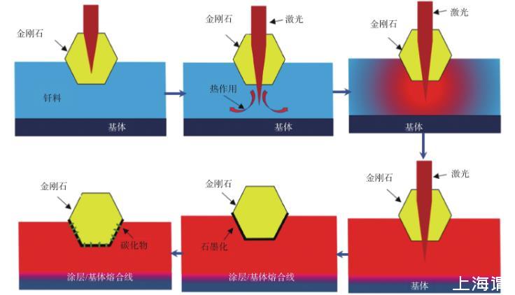 試驗所用激光波長為1.075μm,因此在激光釬涂過程中,激光會透射金剛石而直接加熱釬料,釬料吸收激光能量而迅速升溫、熔化,形成熔池。熔池熱量向金剛石傳導,潤濕金剛石,并誘導與熔池接觸的金剛石表面部分石墨化,與熔池中的Cr等元素發(fā)生反應,形成鉻的碳化物,增強了金剛石與釬料之間的冶金結合強度。釬料直接受熱升溫,金剛石被釬料熱傳導后吸熱升溫。金剛石透射激光的高效低損傷熱作用特性會有效避免金剛石在釬涂過程中的過熱損傷,這是激光釬涂金剛石涂層的最大潛在優(yōu)勢之所在,金剛石透射激光的熱作用如圖13所示。
