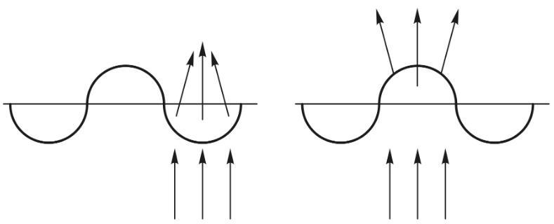 由于水波傳播速度較快,難以直接觀測水波的傳播情況和波峰位置。實驗中通過錄制視頻的方式來觀測水波傳播的過程。首先將透明水槽放置在固定高度的底座上,在水槽下方放置光源。水波波動時表面的起伏會像凸透鏡、凹透鏡一樣將光線會聚或發(fā)散(圖3),此時在水面上方放置整潔的紙張作為屏幕承接光線,便可以看到明暗相間的區(qū)域,分別對應(yīng)水波的波谷和波峰。同時,若將透明的刻度尺放入水中,則可以將刻度尺一同投影到屏幕上,從而測量出水波的位置數(shù)據(jù)。然后,將攝像設(shè)備(手機(jī)及手機(jī)支架)放置在屏幕上方拍攝屏幕上水波的光投影(圖4),記錄水波傳播的過程。最后,使用電腦單幀播放錄制的視頻,從而放慢水波傳播的過程以便于準(zhǔn)確測量波峰位置。此外,由于水滴滴落時形成的是形如同心圓的一組水波,便可以在單幀畫面中測量多個相鄰波峰的位置得到波長。