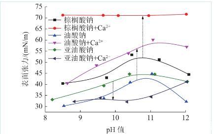 應(yīng)用鉑片法對溶液表面張力進(jìn)行測試,測試前使用乙醇和去離子水對測試玻璃皿進(jìn)行清洗,直至測定去離子水表面張力為72±0.2 mN/m。通過NaOH調(diào)節(jié)38 mL CaCl2溶液pH值,2 mL 4×10-3 mol/L脂肪酸鈉溶液被添加到CaCl2溶液并攪拌2 min,測量并記錄pH值,然后測量溶液表面張力。