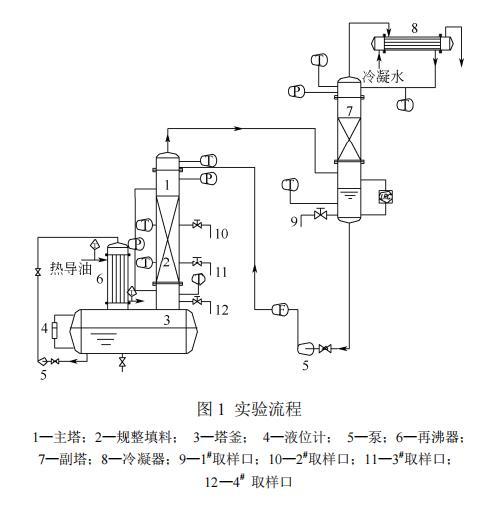 實驗流程如圖1所示。實驗裝置由主塔、副塔、冷凝系統(tǒng)、加熱系統(tǒng)四大部分組成。主塔為內(nèi)徑400mm的不銹鋼精餾塔,填料層裝填高度1.8m,每盤填料高200mm,共9盤。主塔塔頂上升蒸汽及其冷凝液在副塔內(nèi)進行換熱,得到飽和的回流液,避免過冷現(xiàn)象的發(fā)生。塔釜再沸器采用熱導(dǎo)油加熱,換熱面積為27.5m2。塔頂冷凝器采用冷卻水制冷,換熱面積為29.9m2。實驗采用常壓下的全回流操作。