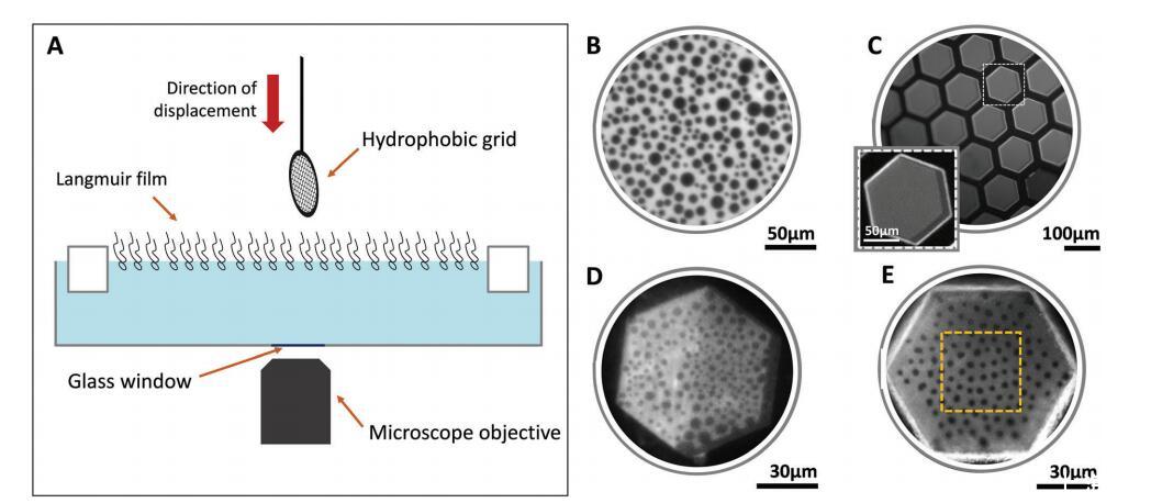 圖 1 用于生成和觀察朗繆爾單層和平面獨立雙層的實驗裝置 (A)。 代表性圖像顯示 表面壓力為 28 mN m 的中性朗繆爾單層膜? 1 (B), 轉(zhuǎn)移后立即包含多個同質(zhì)雙層 (C) 的網(wǎng)格, 和 突出顯示的孔(C 中的插圖)的放大圖,以及顯示相共存的中性 (D) 和帶電雙層 (E)。 橙色虛線方塊 (E) 中顯示的是用于分析的區(qū)域的示例。