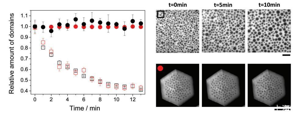 圖 5 帶電(圓形)和中性(方形)雙層(紅色)或單層(黑色)的域相對數(shù)量與時間的關(guān)系。 這些圖像是一個例子 中性單層(上)和帶電(下)雙層在指定時間。 圖像中包含的符號對應于圖像中的相同符號 形象的。 比例尺對應于 50 毫米。