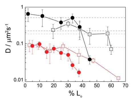 圖 2 擴散系數(shù)(D)的實驗值 小域 (1–3 mm) 作為面積百分比的函數(shù) 由液體有序相。 正方形代表中性系統(tǒng)和 環(huán)繞帶電系統(tǒng)。 黑色符號對應 氣水界面處的單層和雙層的紅色符號。 虛線對應于計算的 Dt 值的范圍 域大小的范圍,使用方程 (2) 或 (3)。 實線只是畫的 引導眼睛。