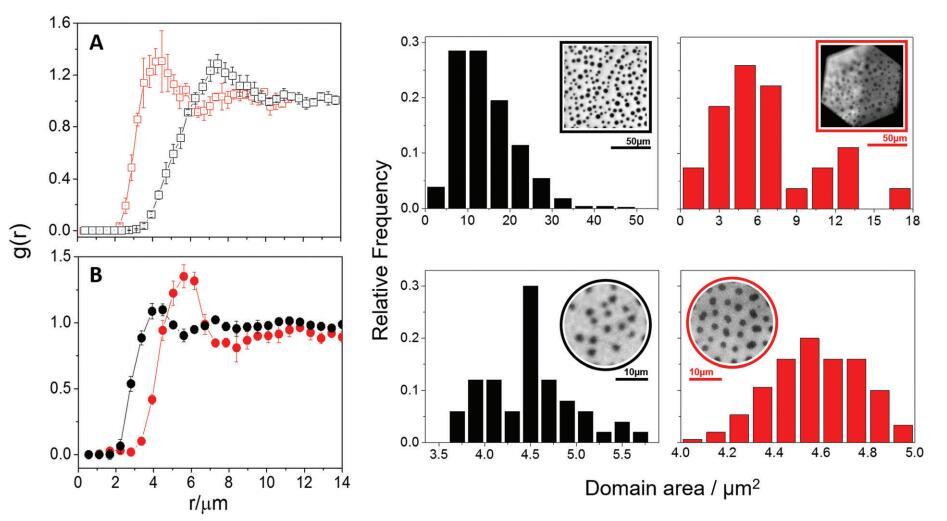 圖 3 中性 (A) 和帶電 (B) 域的徑向分布函數(shù)及其各自的域區(qū)域分布。 雙層顯示為紅色 和黑色的單層。 (A) 中的 %Lo 對應于 20–23%,而 (B) 中的 %Lo 對應于單層和雙層的 16–19%。 插圖:代表性熒光 脂質(zhì)膜的圖像。