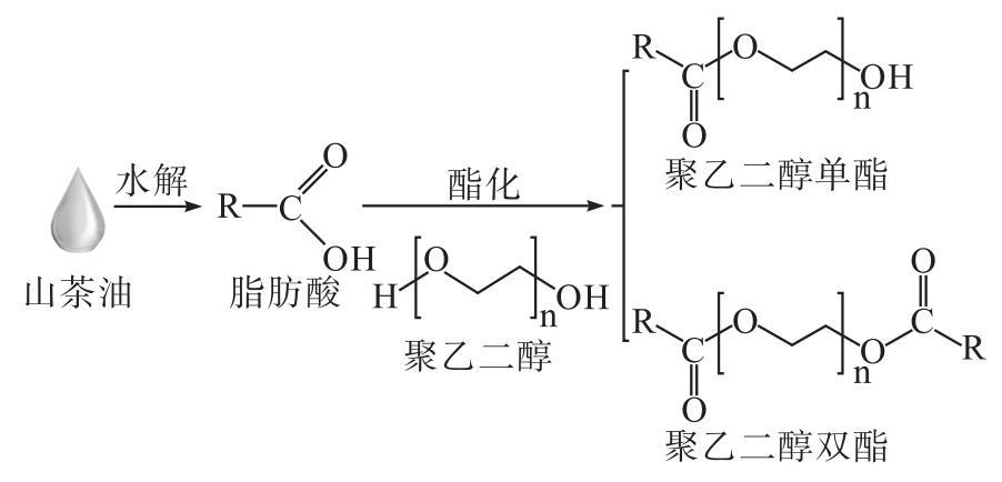 為了解決上述問題,本文以聚乙二醇600(PEG600)和山茶油水解產(chǎn)物為原料,通過水解-酯化兩步法制備改性山茶油,并對(duì)其各項(xiàng)性能指標(biāo)進(jìn)行評(píng)價(jià),為山茶油在水劑型化妝品中的應(yīng)用提供數(shù)據(jù)支持。改性山茶油的制備原理如圖1所示。