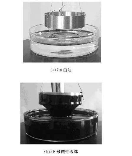 力敏傳感器定標(biāo)數(shù)據(jù)見表1,使用Origin軟件對直線進(jìn)行擬合,可得力敏傳感器靈敏度B=7.727V/N.測量無外加磁場作用的磁性液體表面張力系數(shù)時(shí),為直觀觀察拉脫時(shí)液膜的變化過程,將培養(yǎng)皿放置于電磁線圈端部進(jìn)行測量,圖3為拉脫過程中某一瞬間液膜的收縮狀態(tài),從圖中可看到,磁性液體的液膜拉得更長,液膜收縮的趨勢比白油更明顯,這主要是因?yàn)榇判砸后w中加入的表面活性劑降低了其表面張力。可從表面張力形成原理來分析其中的原因:第一,液體表面張力系數(shù)的大小宏觀上反映出液體表面具有自動(dòng)收縮的趨勢,表面張力系數(shù)較大的白油由于分子和分子之間的引力較大,表面層分子更容易向液體內(nèi)部運(yùn)動(dòng),某一拉力作用下,液膜斷裂,不易拉起較長的液膜;第二,不同液體對同一種固體的浸潤程度不一樣,表面張力系數(shù)小的液體(0.03N/m左右),幾乎能浸潤一切固體;表面張力系數(shù)較大的液體,只能浸潤某些固體;7#白油的表面張力系數(shù)大于磁性液體,片狀吊環(huán)和磁性液體的結(jié)合力大于片狀吊環(huán)和7#白油的結(jié)合力;液膜不容易和片狀吊環(huán)脫離,拉起來的液膜比較長。