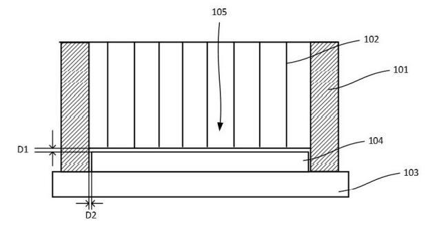 如圖1所示,在一個實(shí)施例中,所述筒壁101的材質(zhì)可以為聚合物、陶瓷、金屬等耐腐蝕的材料,所述筒壁101的形狀例如可以為圓柱狀,所述筒壁101的徑向?qū)挾却笥谒鼍A104的徑向?qū)挾龋鐾脖?01套設(shè)于晶圓104外圍時,所述筒壁101與所述晶圓104邊緣之間的間距D2為30微米~500微米,如100微米、200微米、300微米等,以避免套設(shè)時碰撞晶圓104而造成晶圓104或筒壁101的損傷。