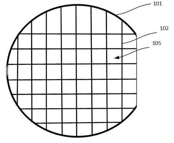 如圖1~圖2所示,本實(shí)施例提供一種用于晶圓104分區(qū)腐蝕的隔離網(wǎng)筒,所述隔離網(wǎng)筒包括:筒壁101,用于套設(shè)于晶圓104外圍,并與所述晶圓104共同被真空吸附臺103吸附固定;隔離網(wǎng)壁102,固定于所述筒壁101內(nèi),用于將晶圓104表面分隔成多個相互獨(dú)立的腐蝕區(qū)域105,當(dāng)所述筒壁101被真空吸附臺103固定時,所述隔離網(wǎng)壁102延伸至晶圓104表面上方,并與晶圓104表面具有間距以形成非接觸氣隙,所述非接觸氣隙被配置為當(dāng)腐蝕液進(jìn)入某一個腐蝕區(qū)域105時,基于液體表面張力使得腐蝕液不會進(jìn)入到與該腐蝕區(qū)域105相鄰的另一個腐蝕區(qū)域105。