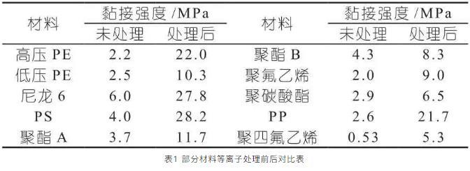 等離子法技術(shù)是利用等離子體高能轟擊、活化反應(yīng)等物理化學(xué)方法,將污染物從工件上剝離去除的一種工藝方法。起到表面有機(jī)物除去,有機(jī)物除去后表面活性化。用等離子法處理PP、PE、聚四氟乙烯等難黏接材料的黏接強(qiáng)度大大提高。經(jīng)處理后接觸角降低,表面張力改變,增加黏接劑對(duì)其浸潤和黏接力。如表1所示。等離子法處理需要投入處理設(shè)備,要根據(jù)實(shí)際需要選擇。