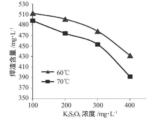 (3)K2S2O8破膠后的殘渣的含量隨著K2S2O8濃度的增加,殘渣含量逐漸下降,溫度越高,殘渣含量相對降低越明顯,對地層損害越小。