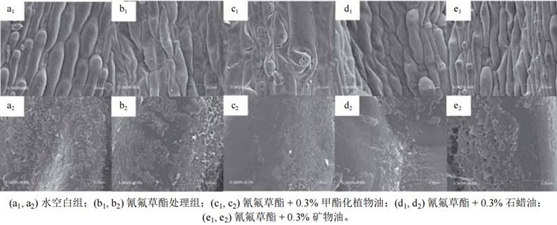 通過掃描電鏡觀察稗草葉片結構變化探究了油類助劑對氰氟草酯防除稗草的增效作用。作者分別對比了純水、氰氟草酯處理和添加油類助劑的氰氟草酯處理后的稗草葉片結構,發(fā)現(xiàn)水對稗草葉表面的蠟質層和表皮細胞沒有任何影響(圖1a1,a2),氰氟草酯使表皮細胞略有萎縮(圖1b1),溶解了少量的表皮蠟質層(圖1b2),而添加油類助劑后均發(fā)生表皮細胞變窄萎縮和蠟質層溶解的現(xiàn)象(圖1c1-e2)。其中,石蠟油和礦物油能使表皮細胞變窄變小,水分減少(圖1d1,e1),溶解大約30%的表皮蠟質(圖1d2,e2)。甲酯化植物油(MSO)能較大程度地使表皮細胞萎縮(圖1c1),溶解超過50%的蠟質層(圖1c2)。正是因為MSO(體積分數(shù)0.5%)溶解了大量稗草葉片的表皮蠟質層,嚴重破壞了葉片的角質層,從而極大地增強了稗草葉片對氰氟草酯的滲透和吸收能力,使其對氰氟草酯防除稗草的防效提高了78.7%。